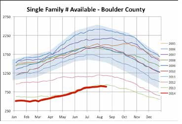 Above is a chart noting the sales figures for the amount of Single Family Homes sold in Boulder County from 2005-2014. Note the above Bell Curve is representative of the chart that I featured in our State of the Market Update entitled "Thinking About Selling This Spring?" last December. 2005-2011 shows a high degree of consistency year over year with accustomed seasonal variances, albeit with varying amounts of volume sold contingent upon the particular year. 2012 noted a steep drop off, followed by another substantial inventory decline in 2013 with 2014 following in lockstep if not worse.