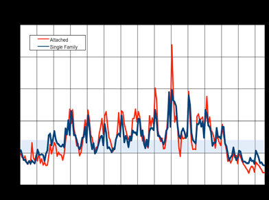 The below chart represents how Single Family Home sales are mimicking Condo/Townhome sales, where inventory pressure is not judgmental on the variety of home on the market. The vertical lines starting on the far left start at the year 2000, each vertical line to the right represents another year, so the far right abbreviated vertical line that makes up the border represents August 2014. The horizontal lines represent month of inventory, so the lowest vertical line is at 5 months, then the one above it is 10 months, up to increments of 5 months to top out at 25 months of inventory at the top of the margin. A healthy real estate market will support roughly 7 months of inventory, we're currently at about 50% of that figure.