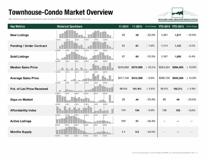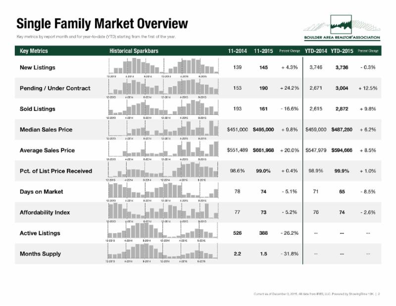 The Boulder Area Realtor Association and Land Title Guarantee Company have recently released their figures for November, be sure to click on those hotlinks above to access those reports for greater detail. Both reports have outstanding graphs, charts, and data that show the health of our local real estate market. In short, the statistics for both Single Family Homes and Condo's/Townhomes continued to show strength and positive trends; which is continued good news for the market going into 2016.